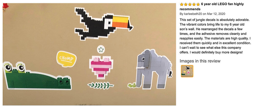 This set of jungle decals is absolutely adorable. The vibrant colors bring life to my 6 year old son's wall. He rearranged the decals a few times, and the adhesive removes cleanly and reapplies easily. The materials are high quality. I received them quickly and in excellent condition. I can't wait to see what else this company offers. I would definitely buy more designs!