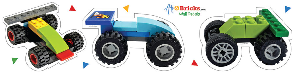 This set of cars, made from building bricks, features 3 unique, colorful LEGO brick-built race car designs. Each car sticker measures about 5 inches tall and is between 6 and 8 inches wide.